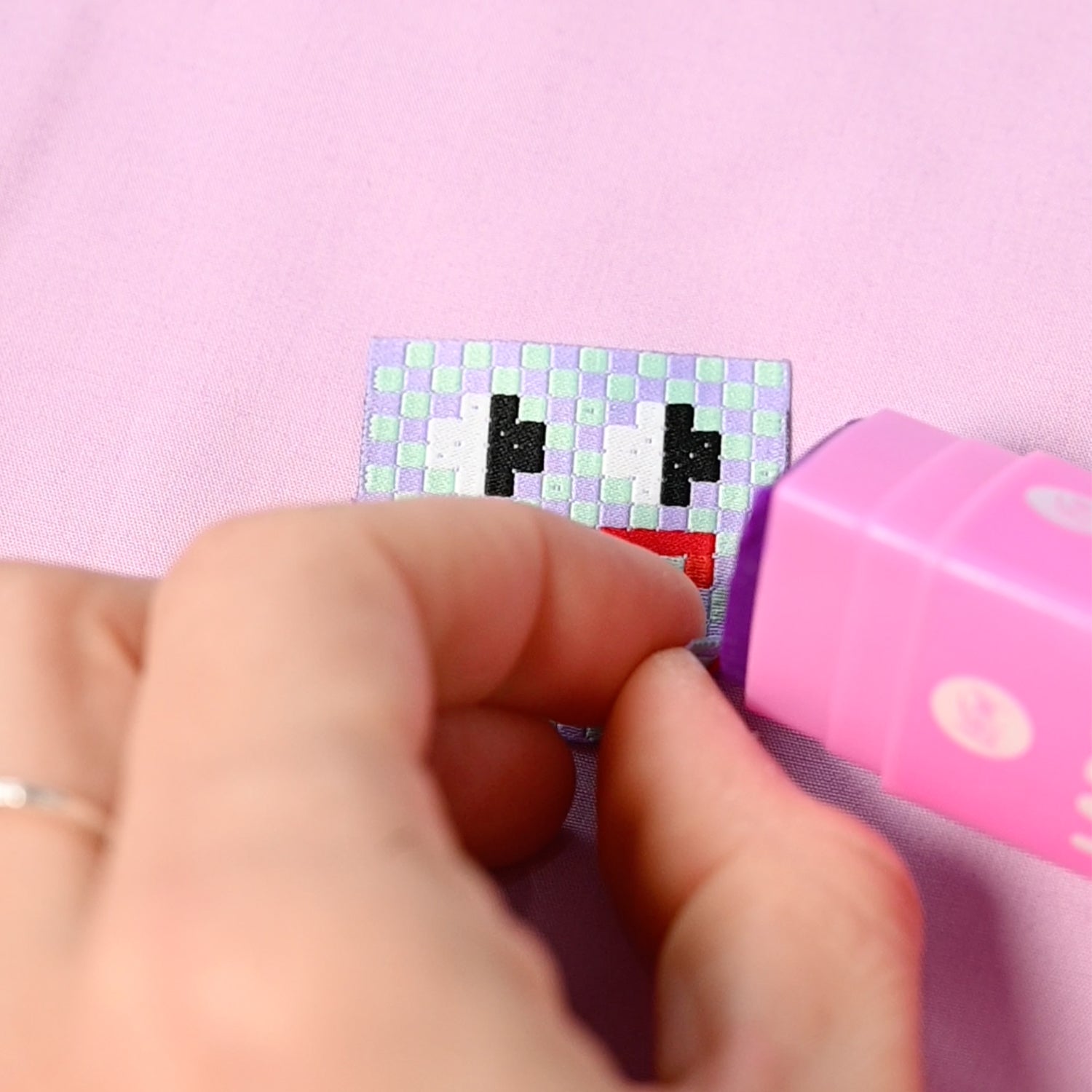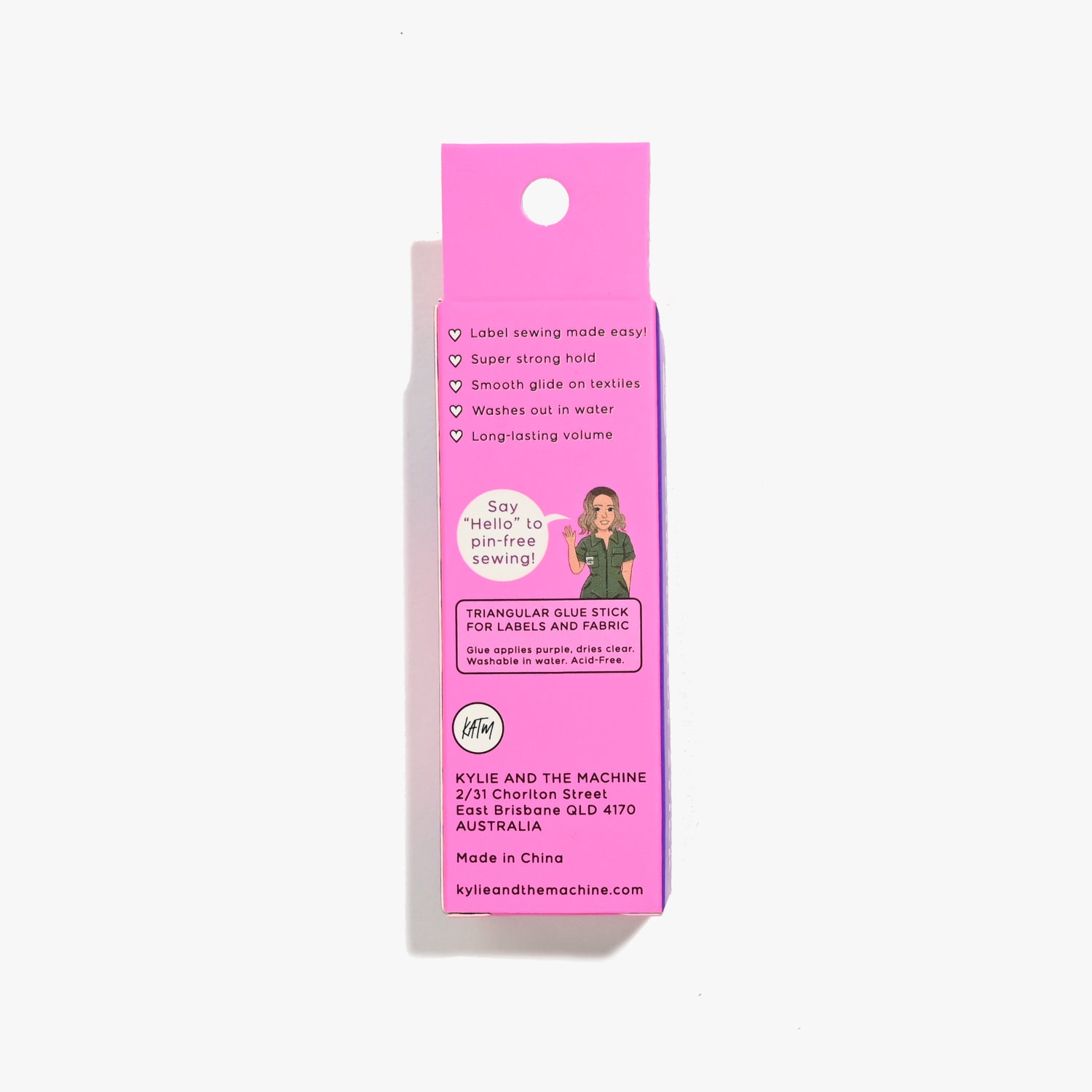 It's your new fav handy helper for keeping labels in place when sewing them in. Use this glue when topstitching in your labels, it will hold better than a pin and you can sew straight over the label with your machine (it also won't gum up your machine - woohoo!).